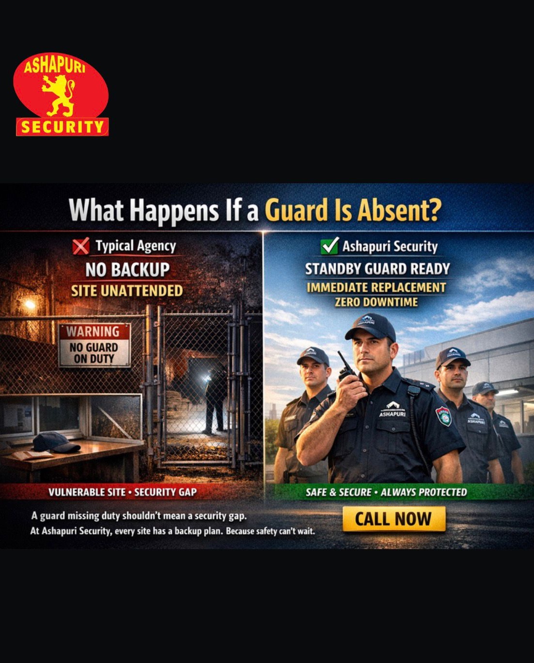 A guard missing duty shouldn’t mean a security gap. At Ashapuri Security, every site has a standby guard ready. Immediate replacement. Zero downtime. Because safety can’t wait. 📞 Call now for reliable security.