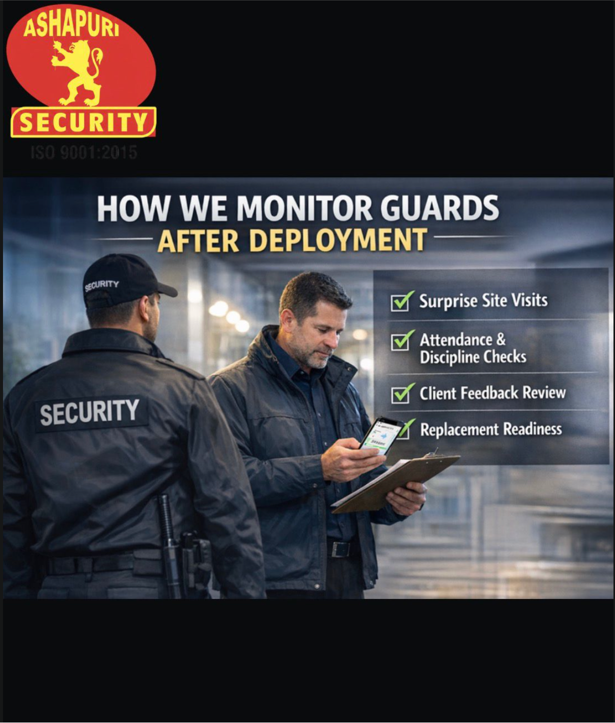 Security doesn’t end at deployment — that’s where it begins. Our structured supervision system ensures every guard remains alert, disciplined, and accountable through regular checks, client reviews, and readiness planning. Ashapuri Security Services. Consistency you can trust.