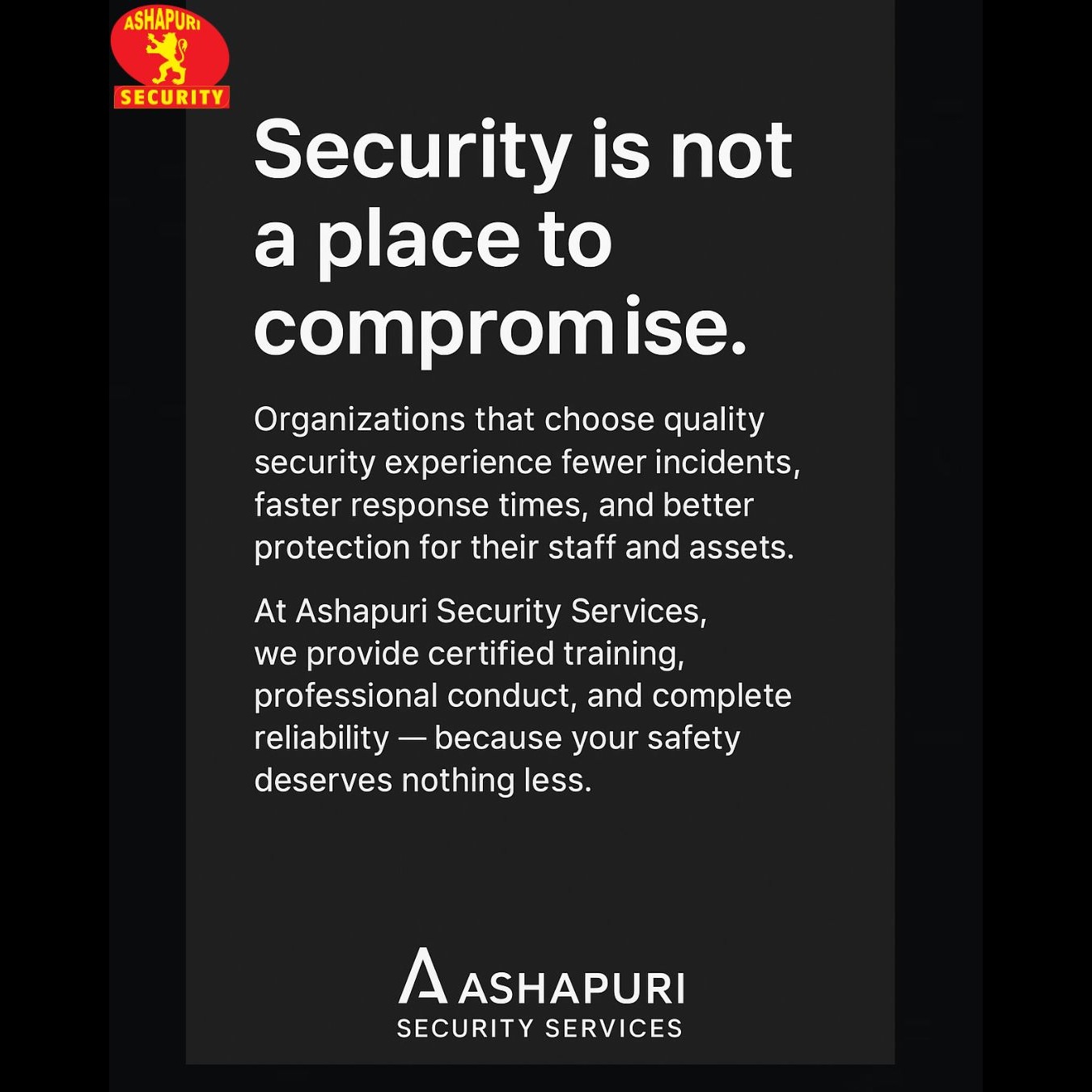 Security isn’t an area to take risks. Choose trained professionals who protect your people, assets, and reputation — every single day. Ashapuri Security Services: Because safety deserves quality. 📞 Call now 9425064985